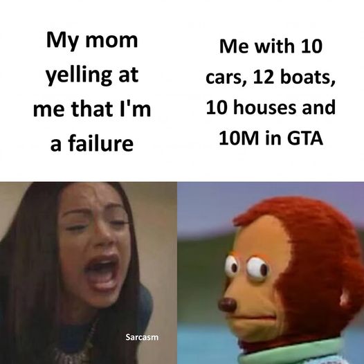 My mom yelling at me that I’m a failure. Me with 10 cars, 12 boats, 10 houses and 10M in GTA