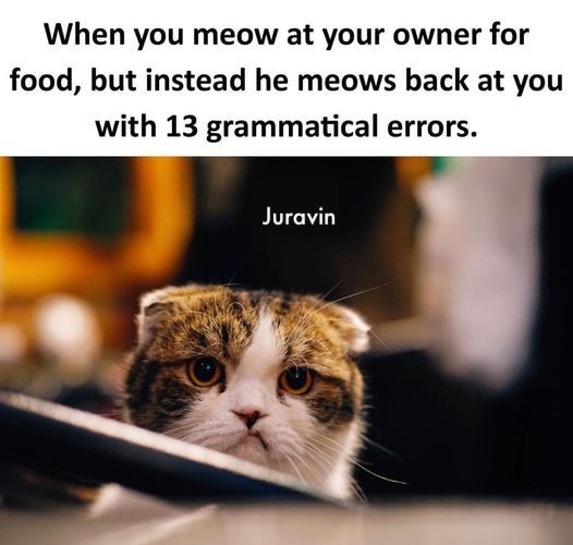 When you meow at your owner for food, but instead he meows back at you with 13 grammatical errors: